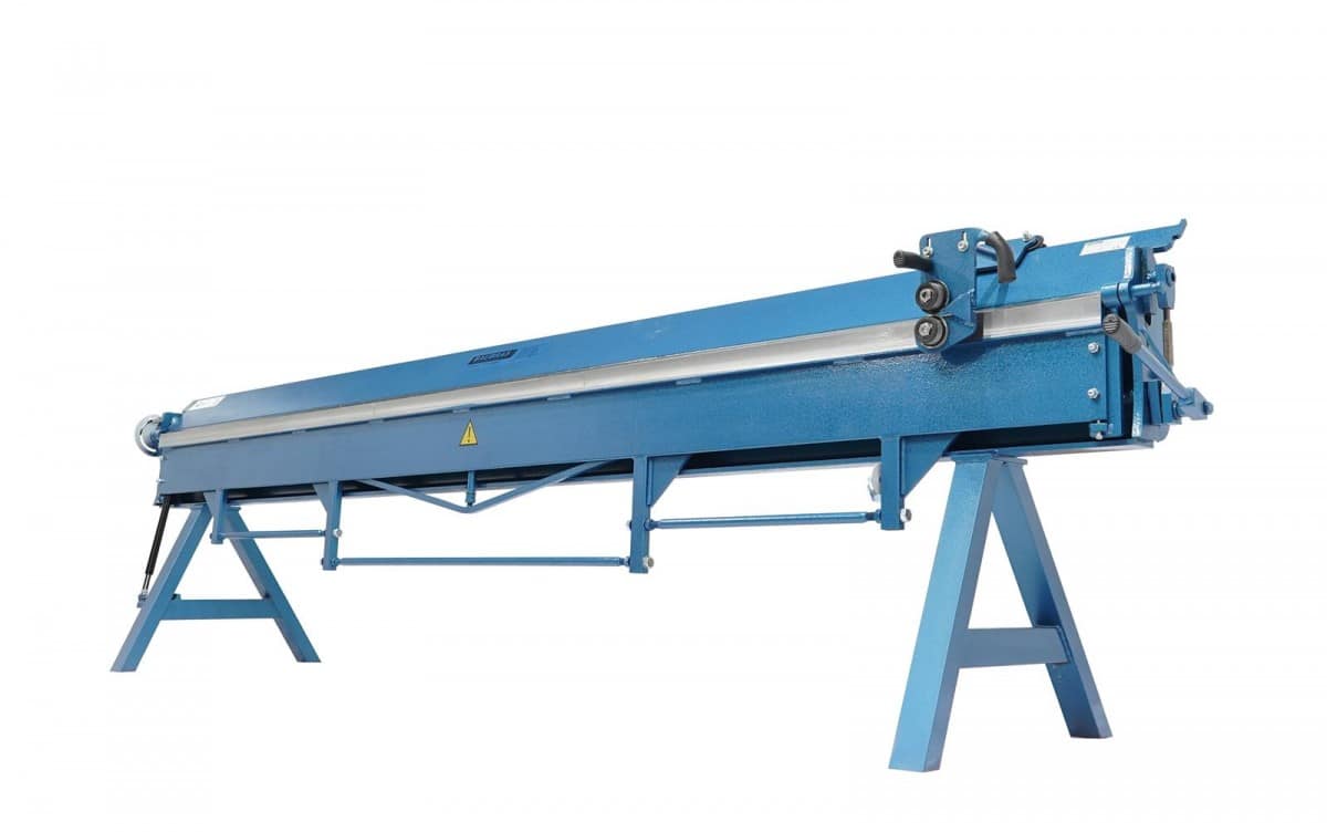 The sheet metal bending machine has a holder for the cut sheet metal at the outlet, a protractor, angle stop and gas pressure damper to slightly position the bending beam in the height.